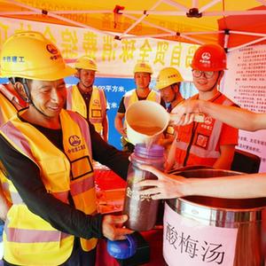 8月23日,青島自貿全球消費綜合體項目部“清涼驛站”的工作人員為建設者分發酸梅湯。