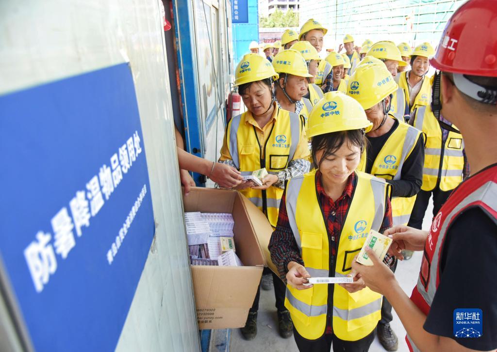 8月23日,青島自貿全球消費綜合體項目部的工作人員為建設者發放防暑藥品。