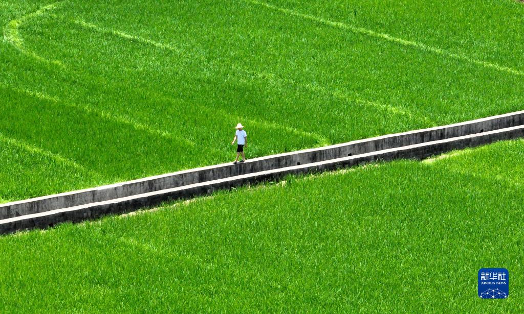 8月23日,在廣西柳州市柳江區穿山鎮竹山村,村民在田間檢查水渠來水情況(無人機照片)。