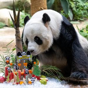 8月23日,旅馬大熊貓“興興”和“靚靚”迎來16歲生日,馬來西亞國家動物園特地為它們準備了生日大餐,為這對“夫婦”慶祝?!芭d興”和“靚靚”2014年租借給馬來西亞,先后產下三個寶寶。