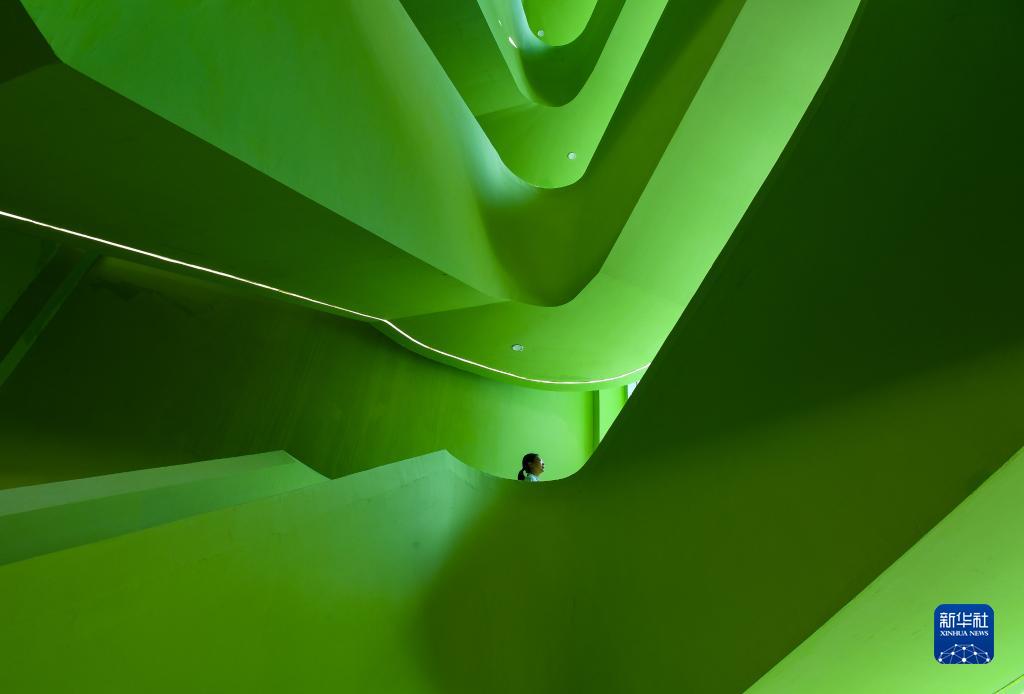 8月23日,一名物業人員行走在廣州南沙民心港人子弟學校教學樓旋轉樓梯上。