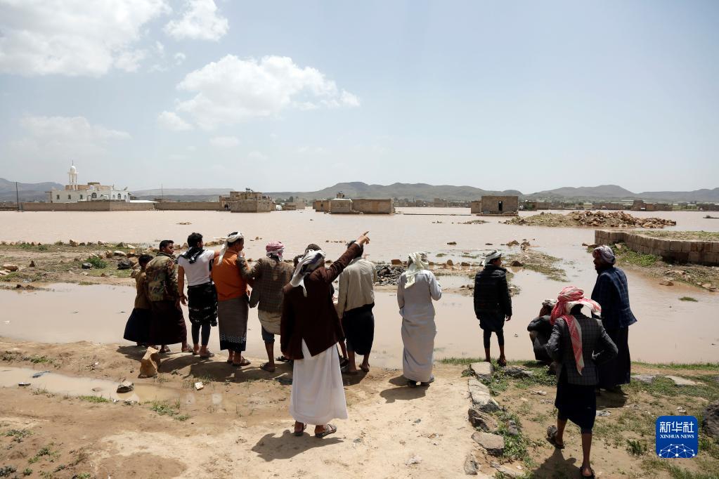 8月23日,在也門扎馬爾省馬巴爾地區,人們查看被洪水淹沒的土地。