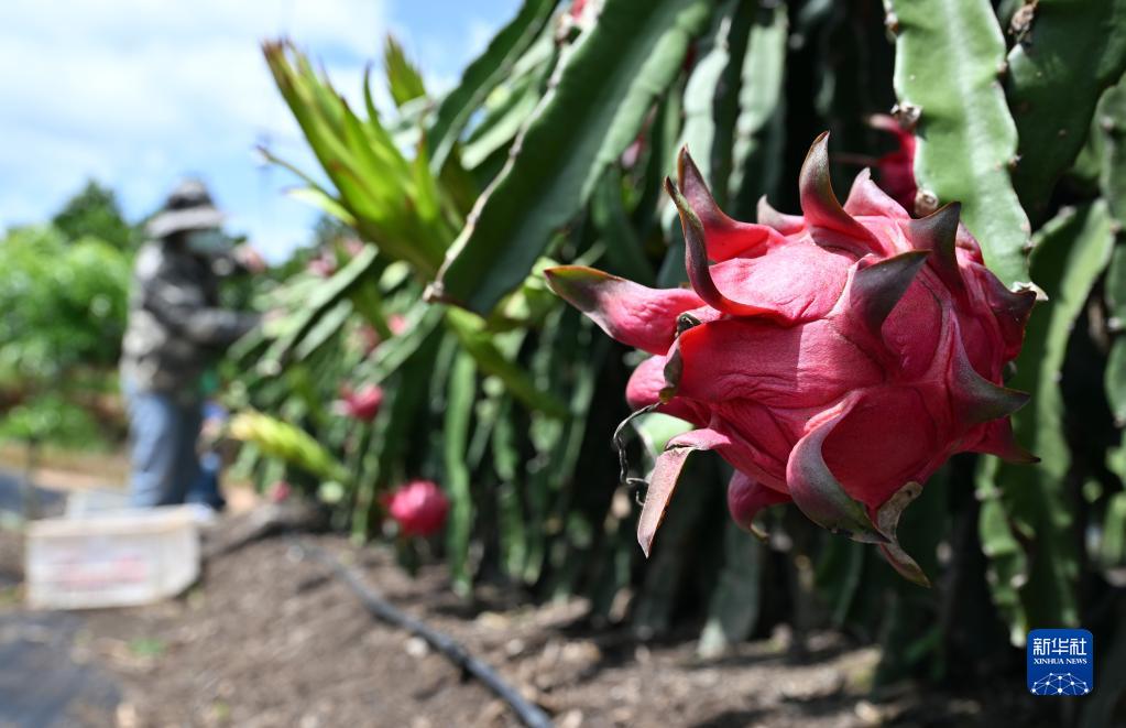 8月24日,村民在三亞市育才生態區馬腳村“水果島”火龍果生產基地采摘火龍果。