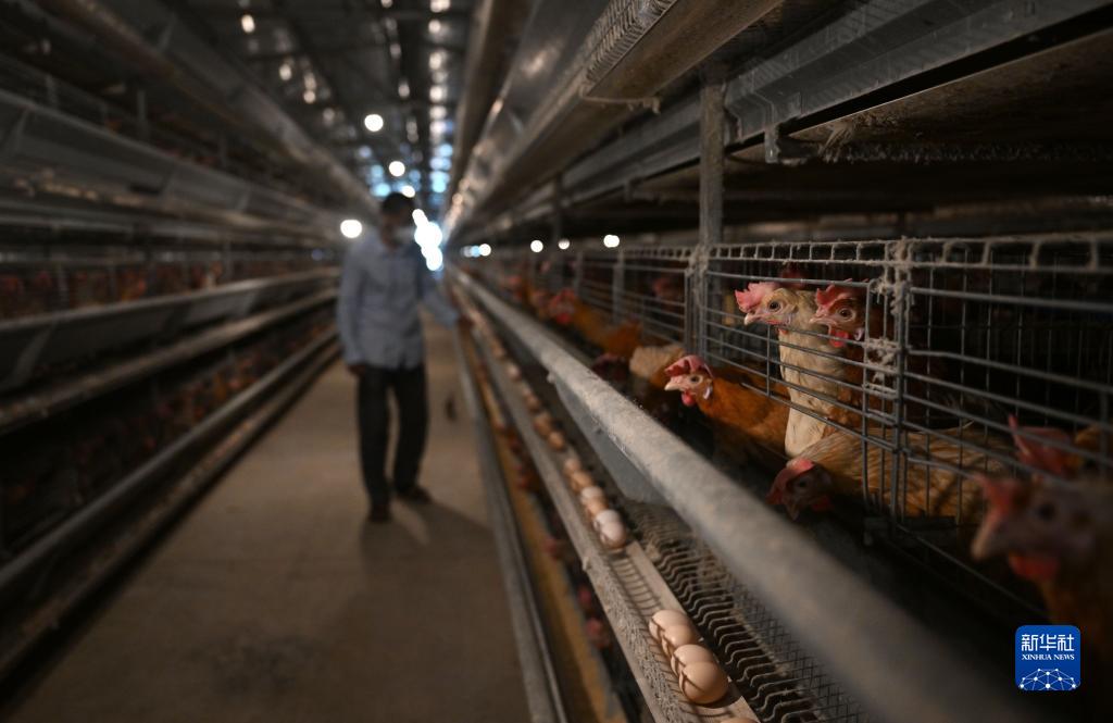 8月24日,村民在三亞市育才生態區那會村養殖基地查看蛋雞進食情況。