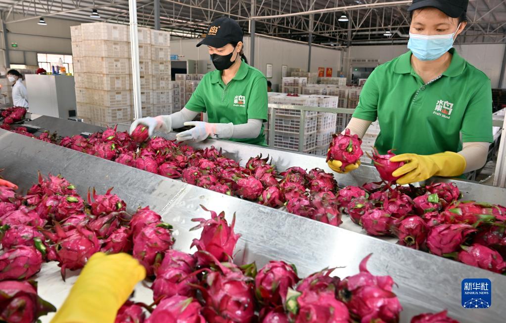 8月24日,村民在三亞市育才生態區馬腳村“水果島”火龍果生產基地分揀火龍果。