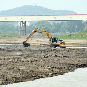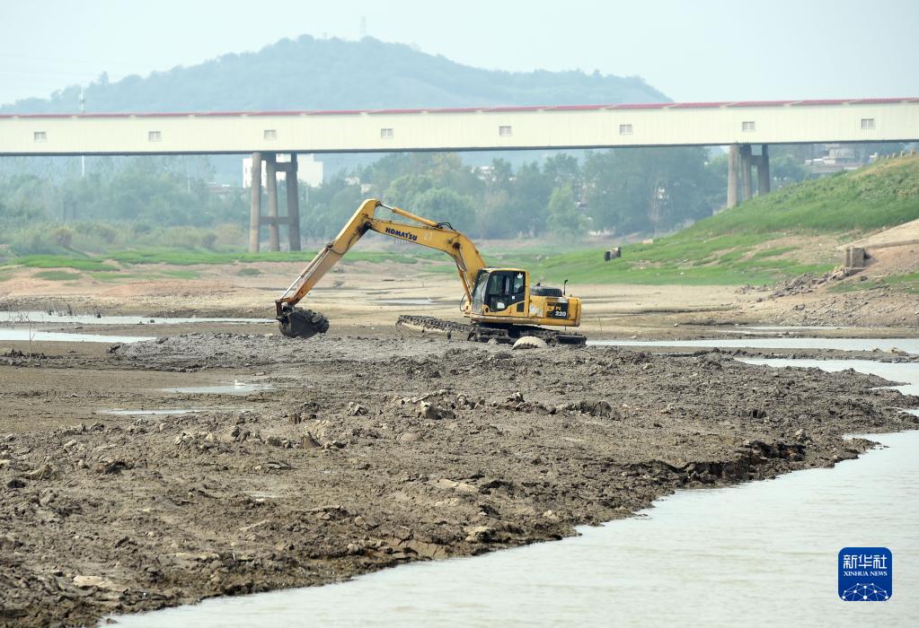8月23日,在安徽省蕪湖市繁昌區荻港鎮,水上挖掘機在河道里進行清淤作業,疏通引水渠道。
