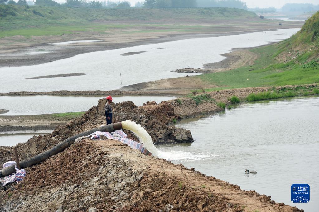 8月23日,在安徽省蕪湖市繁昌區孫村鎮,工作人員在架設的臨時抗旱站用水泵將河水抽入引水渠道,為農業生產提供灌溉水源。