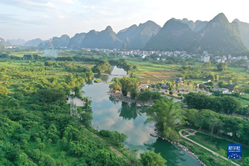 時下,廣西桂林市陽朔縣遇龍河沿岸山清水碧,草木蔥郁,在藍天白云掩映下,一派生機盎然景象。