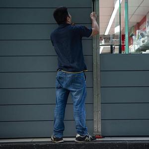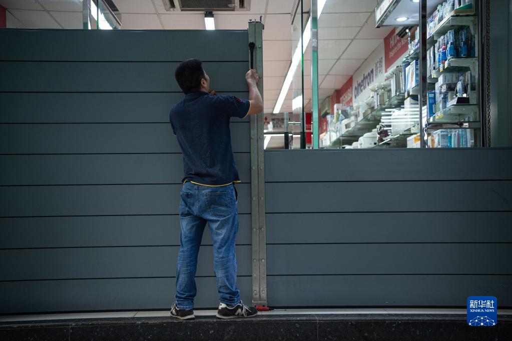 8月24日,澳門一家商戶工作人員在加裝防水閘。