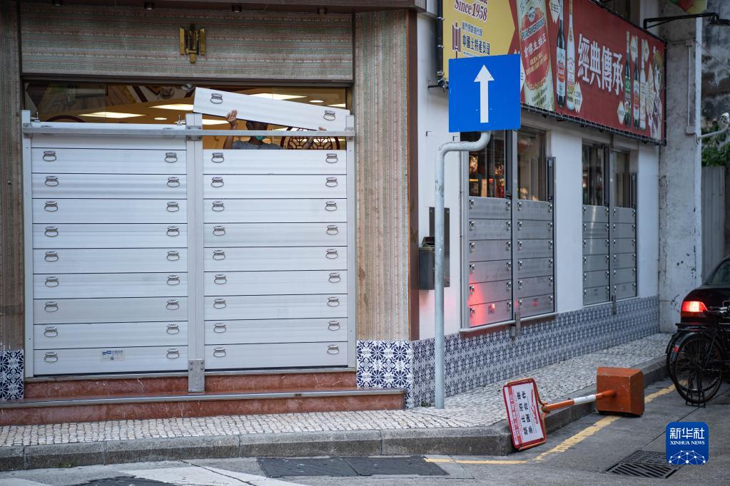 8月24日,澳門十月初五街一家商戶工作人員在加裝防水閘。
