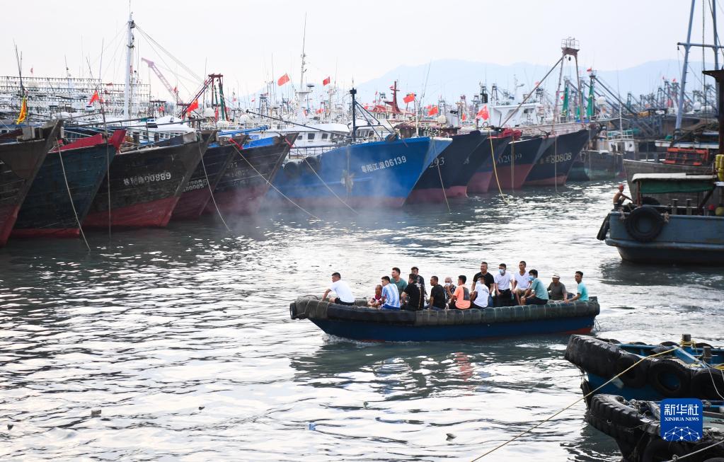 8月24日,在廣東陽江市海陵島閘坡國家級中心漁港,海上從業人員搭乘小艇靠岸。