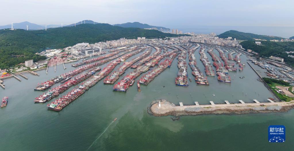 8月24日,在廣東陽江市海陵島閘坡國家級中心漁港,停滿了歸港避風的漁船(無人機照片)。