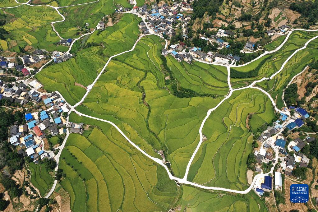 時下,貴州高原各地水稻長勢喜人,陸續進入成熟期,金燦燦的層層稻田與民居、公路、河流、山巒等相映成景,構成一幅幅迷人的高原鄉村田園畫卷。