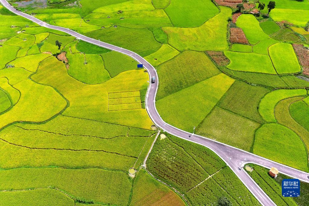 時下,貴州高原各地水稻長勢喜人,陸續進入成熟期,金燦燦的層層稻田與民居、公路、河流、山巒等相映成景,構成一幅幅迷人的高原鄉村田園畫卷。