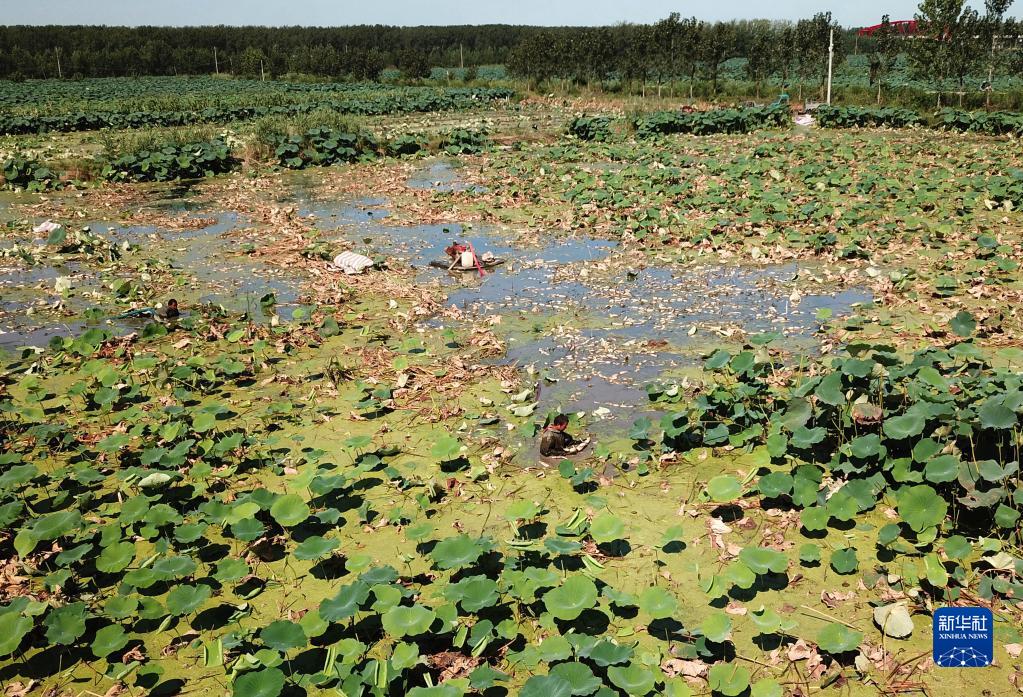 8月24日,在山東省微山縣高樓鄉,村民在采挖收獲蓮藕(無人機照片)。