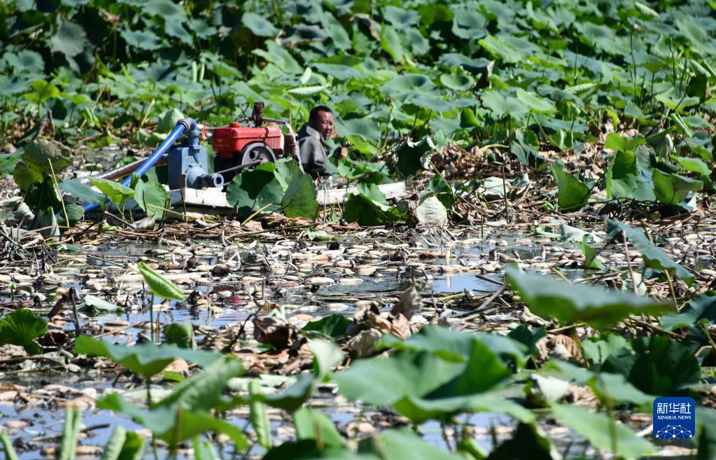 8月24日,在山東省微山縣高樓鄉,村民采挖收獲蓮藕。
