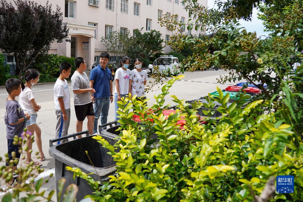 8月24日,威海市魏橋社區工作者張帥克(右三)和孩子們一起討論社區垃圾分類管理問題。去年7月,該社區成立由不同年齡段少年兒童組成的兒童議事會,為兒童提供平等對話平臺。