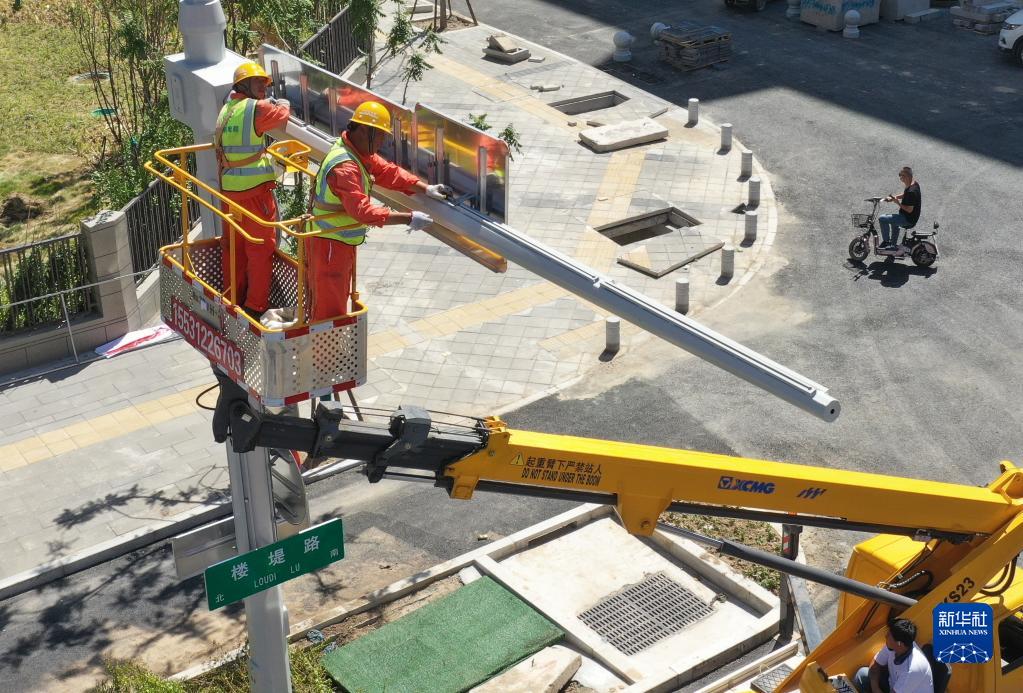 8月25日,工人在雄安新區容西片區進行市政安裝施工(無人機照片)。