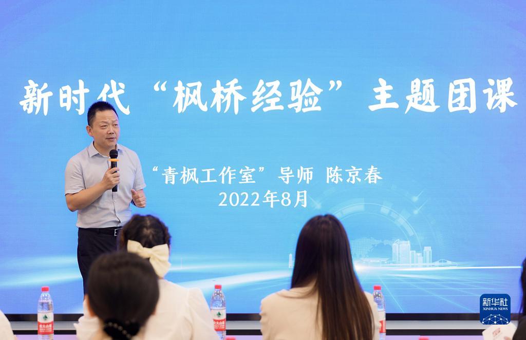 8月25日,浙江省諸暨市“青楓工作室”導師陳京春給青年學子講授新時代“楓橋經驗”主題團課。