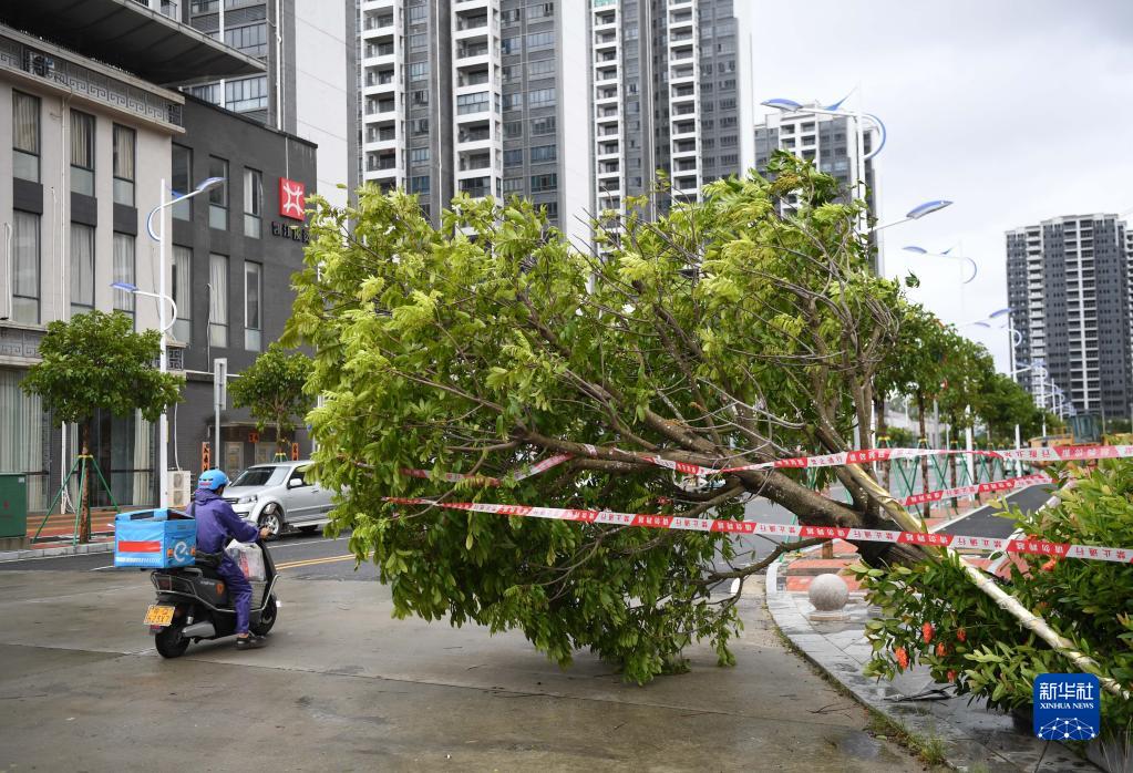 8月25日,在廣東陽江市石灣路路口,快遞員從倒伏的樹木旁駛過。