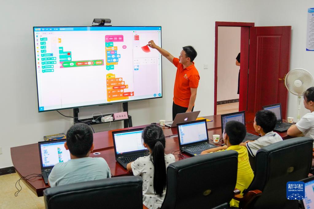 8月24日,在重慶豐都縣高家鎮汶溪社區黨群服務中心內,一名家庭教育互助會的志愿者在為學生上機器人編程課。