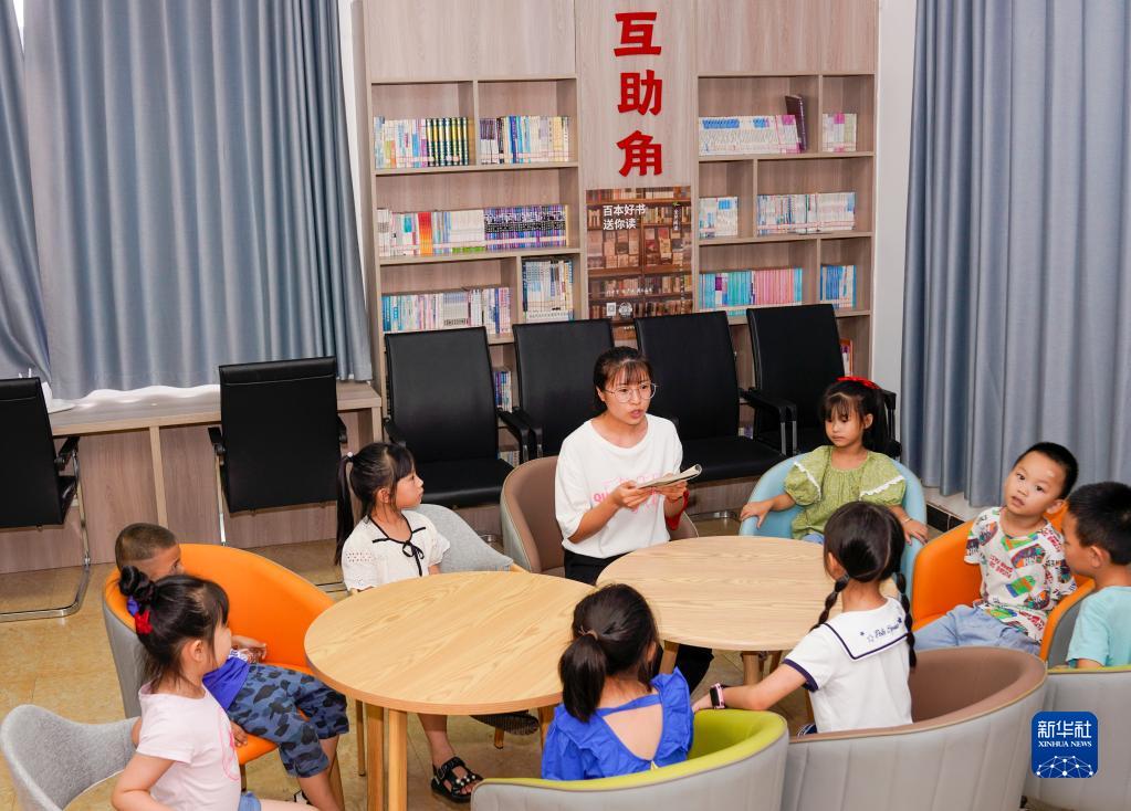 8月24日,在重慶豐都縣高家鎮汶溪社區黨群服務中心內,一名家庭教育互助會志愿者領著孩子誦讀唐詩。