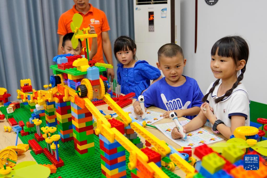 8月24日,在重慶豐都縣高家鎮汶溪社區黨群服務中心內,幾名加入家庭教育互助會的孩子在體驗兒童機器人課程。