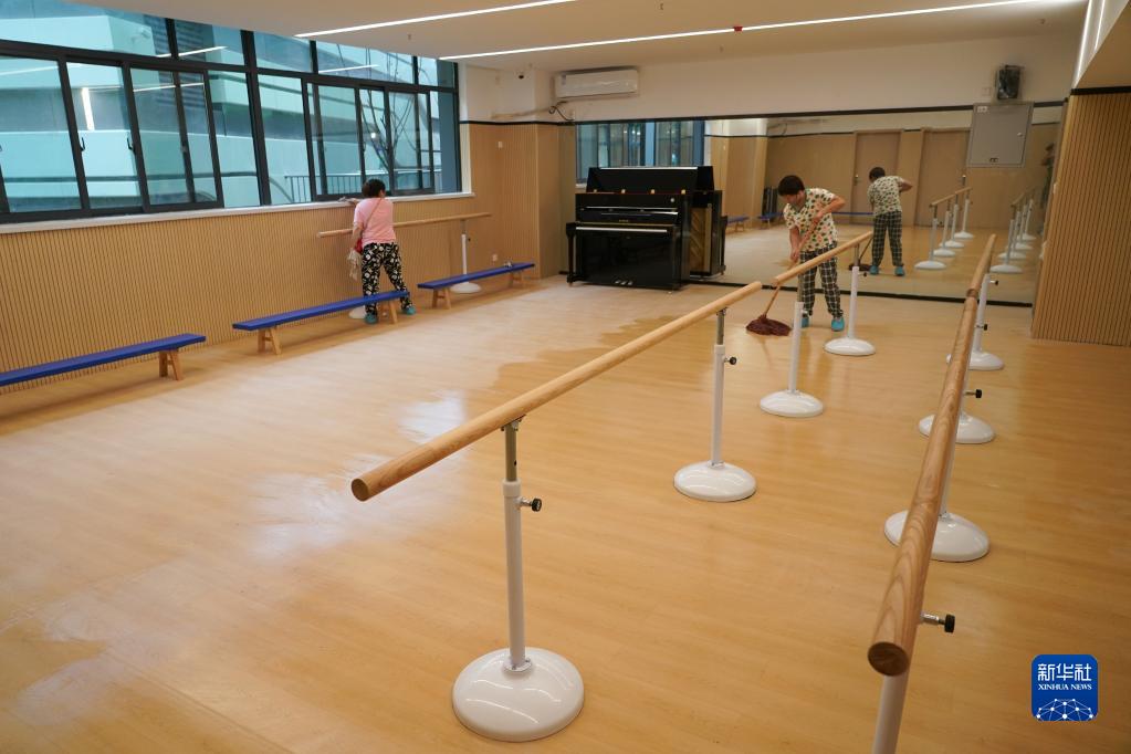 8月25日,在新建成的西安市雁塔區第一小學的一間舞蹈教室內,保潔人員在打掃衛生。