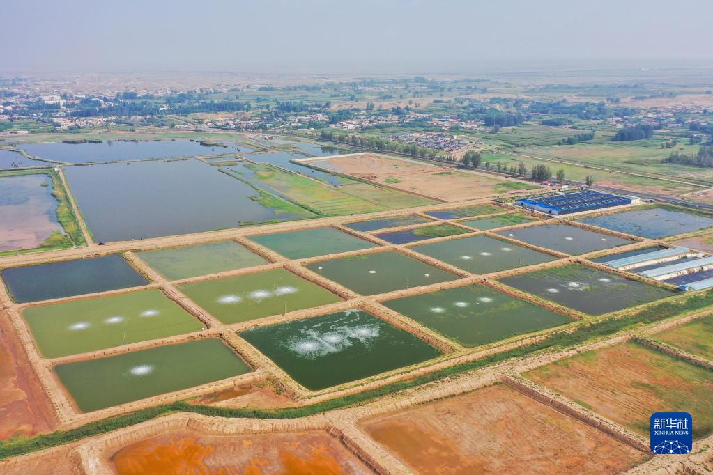 俯瞰烏海市鹽堿水對蝦養殖園區的蝦田(8月25日攝,無人機照片)。