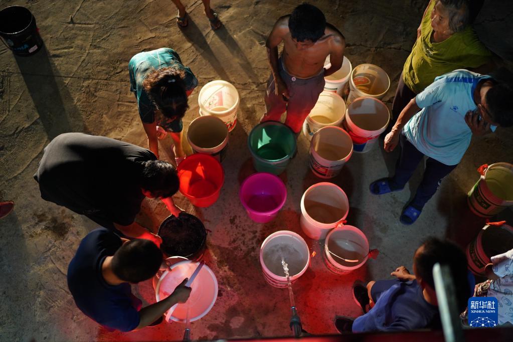 瑞昌市范鎮上源村村民用桶裝消防員送來的水(8月23日攝)。