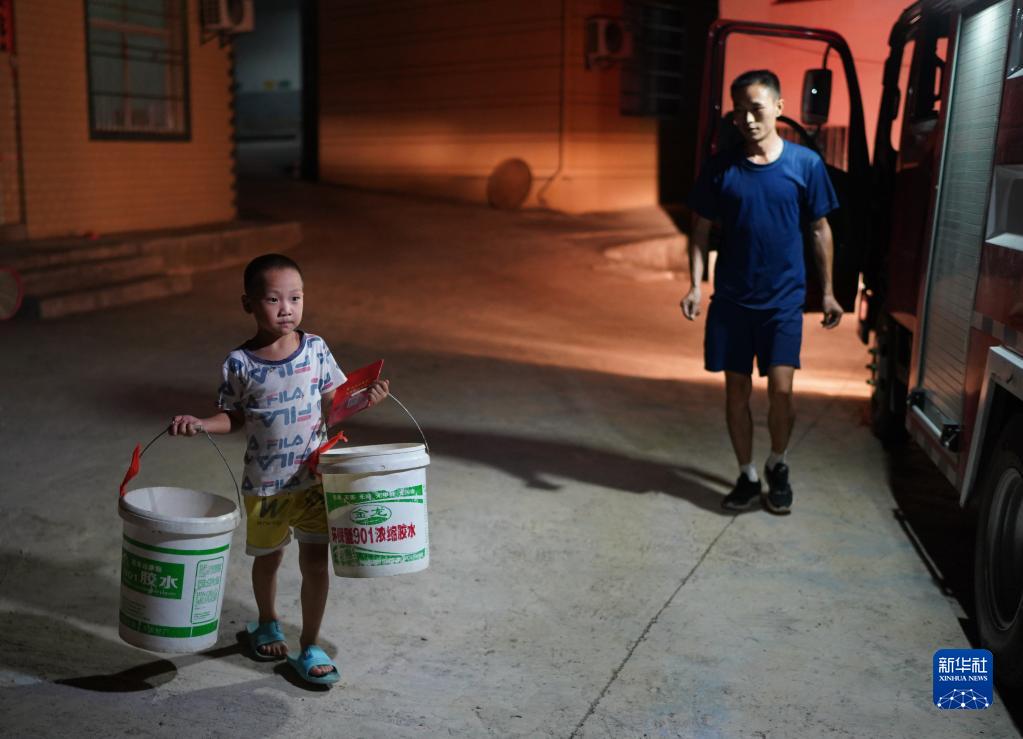 消防員來到瑞昌市范鎮上源村送水,一名小孩拿著水桶準備接水(8月23日攝)。