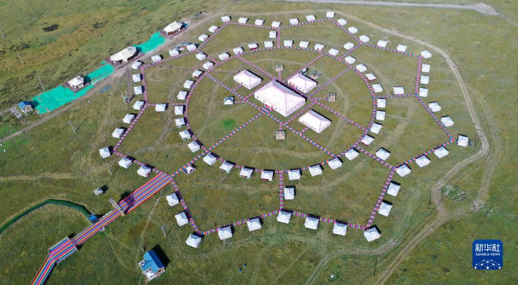 這是甘肅省甘南藏族自治州碌曲縣尕海鎮尕秀村帳篷城景區(無人機照片,2021年9月9日攝)。新華社記者 陳斌 攝