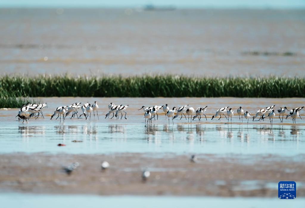 一群反嘴鷸在閩江河口濕地里停留覓食(8月25日攝)。