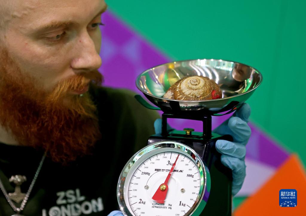 8月25日,在英國倫敦動物園,工作人員為一只蝸牛稱重。