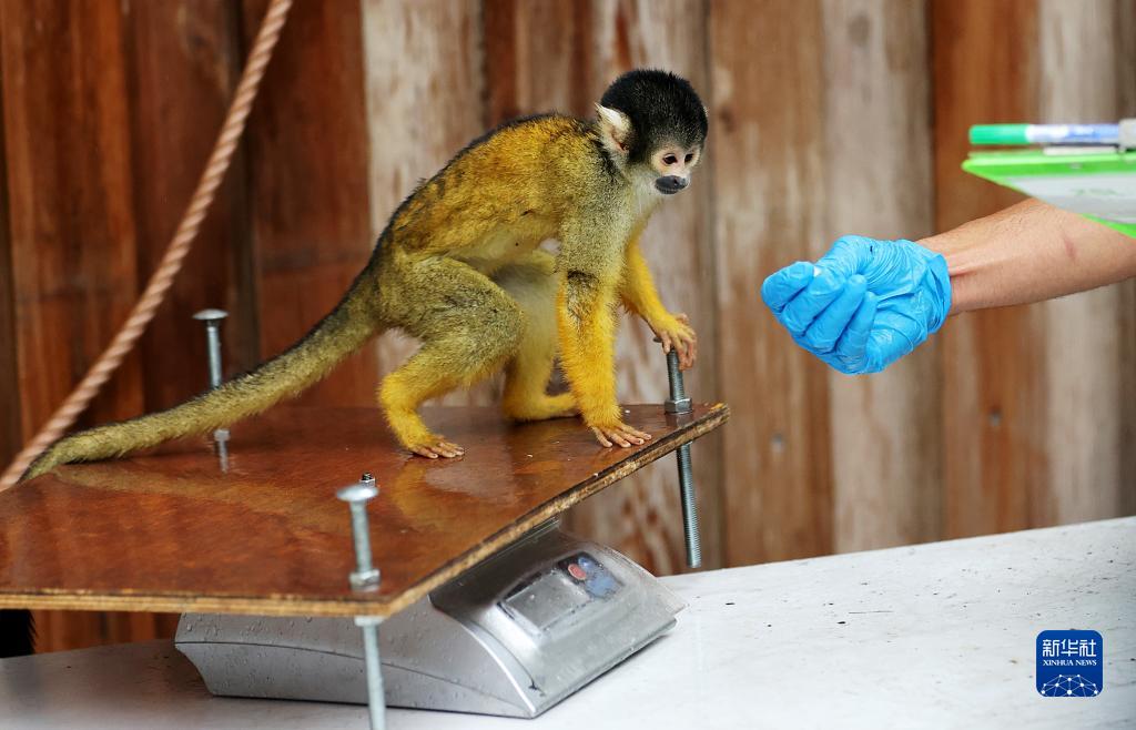 8月25日,在英國倫敦動物園,工作人員為一只松鼠猴稱重。