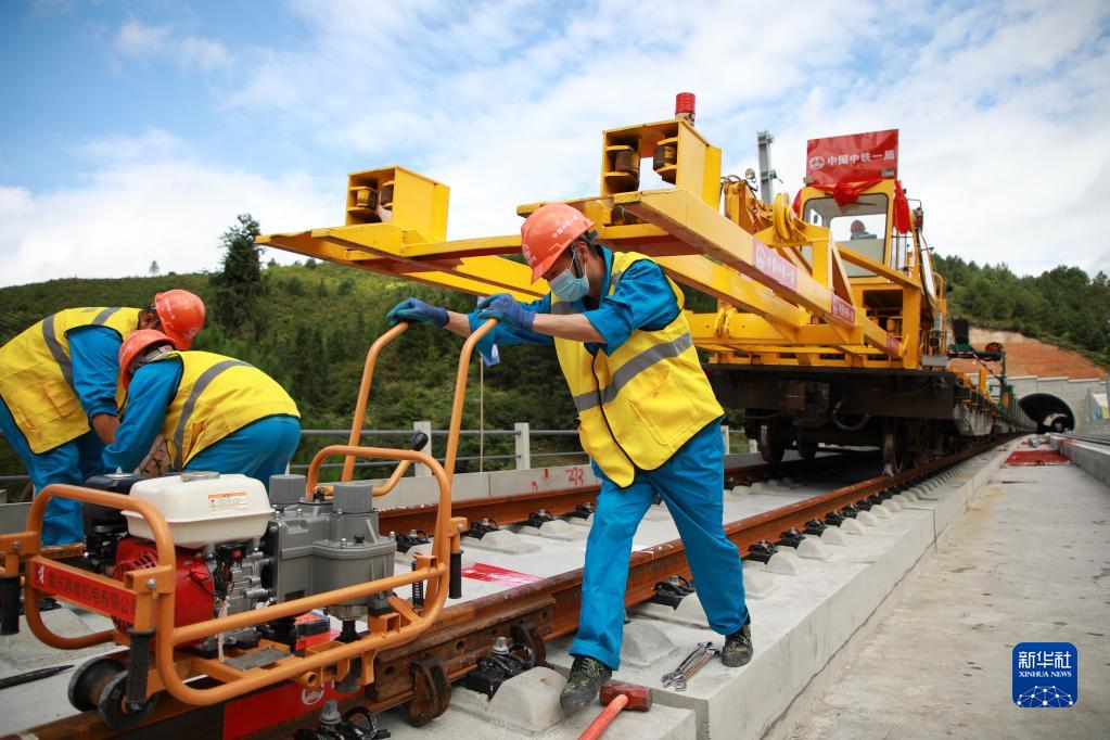 8月26日,中鐵一局建設者們在進行鋪軌施工。