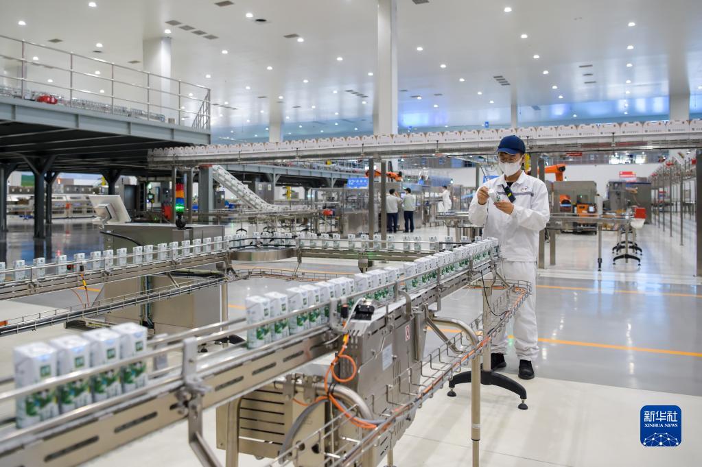 8月25日,在位于呼和浩特市的伊利現代智慧健康谷液態奶全球智造標桿基地,工人在生產線上作業。新華社記者 李志鵬 攝