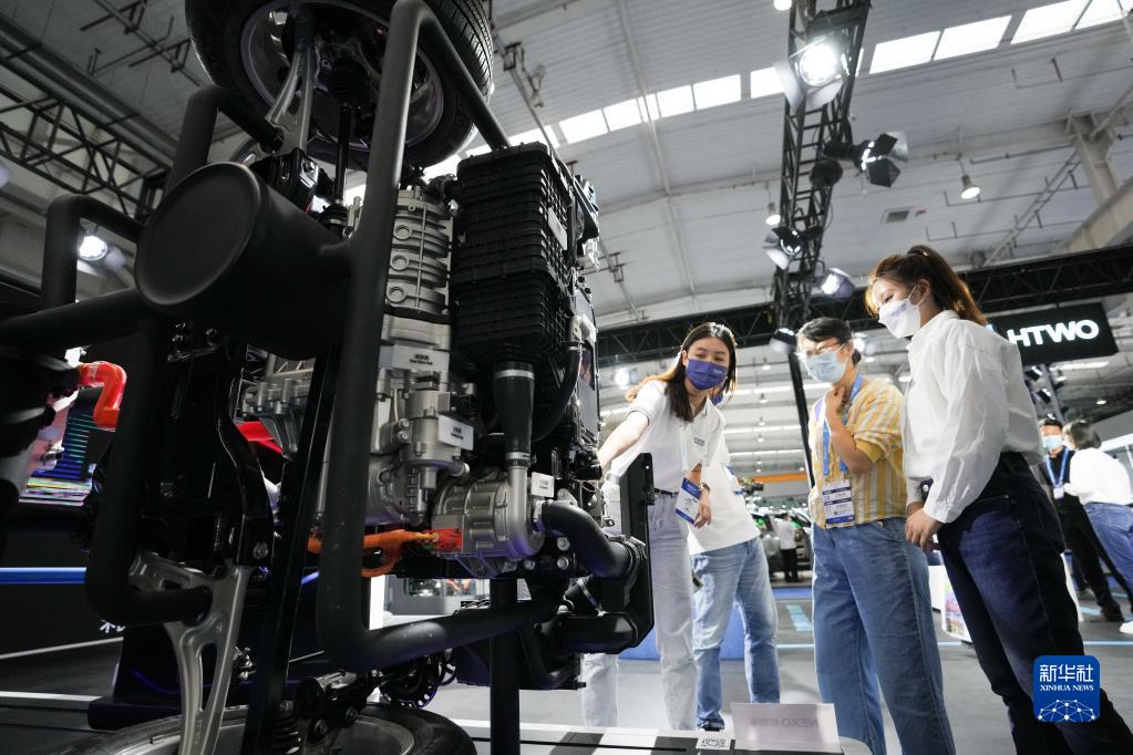 8月26日,參觀者在了解展出的一款氫燃料電池車的車身結構和工作原理。