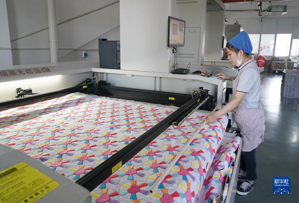 在安康市恒口示范區一家毛絨玩具生產企業車間內,工人操作機器生產毛絨玩具面料(2021年7月7日攝)。