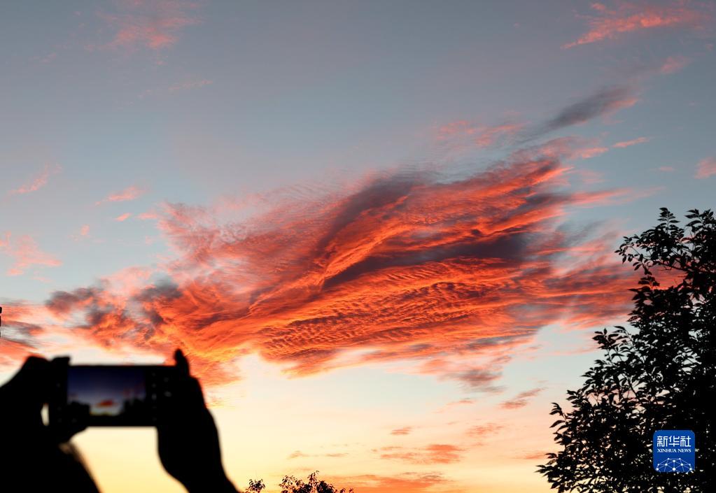 8月26日,一位準備夜游八達嶺長城的游客拍攝落日彩云。