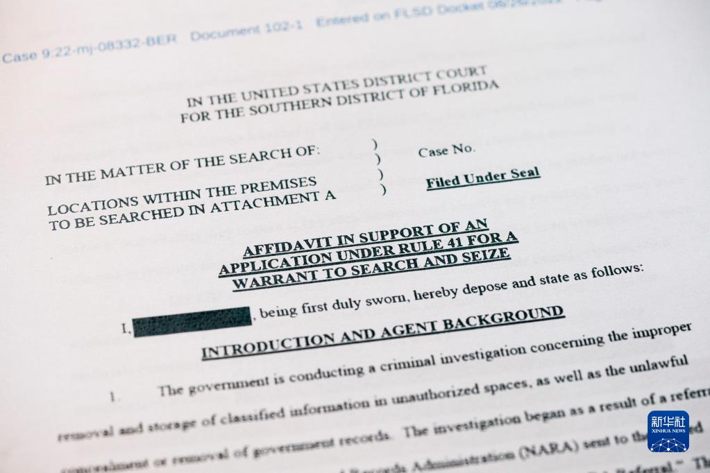 這是8月26日拍攝的美國聯邦調查局申請搜查前總統特朗普住所海湖莊園時向法院提交書面證詞的部分內容。