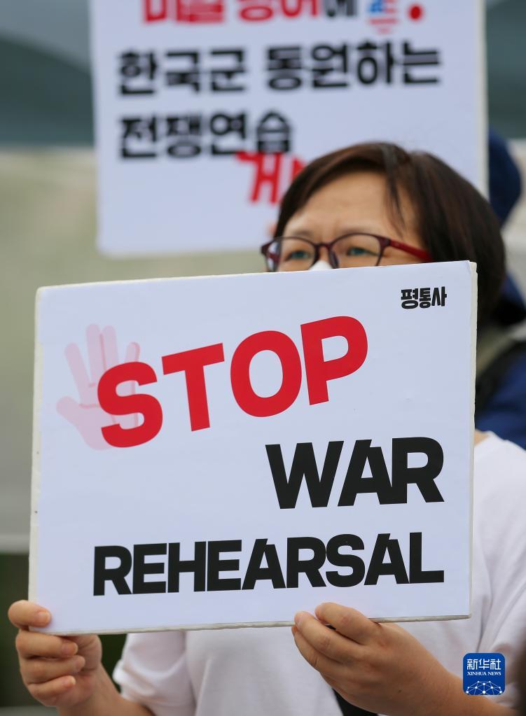8月22日,集會者手持標語牌在韓國首爾參加集會反對韓美軍演。韓美兩國軍隊22日正式啟動下半年“乙支自由之盾”聯合軍演。韓國多個民間團體當天在首爾舉行抗議集會。新華社記者 王益亮 攝