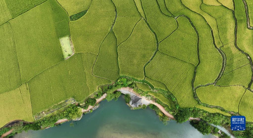 初秋,貴州省貴陽市開陽縣禾豐鄉馬頭村近千畝優質稻谷長勢喜人,田園、村莊、河流、鄉村公路組成一幅貴州高原獨特的田園豐收畫卷。