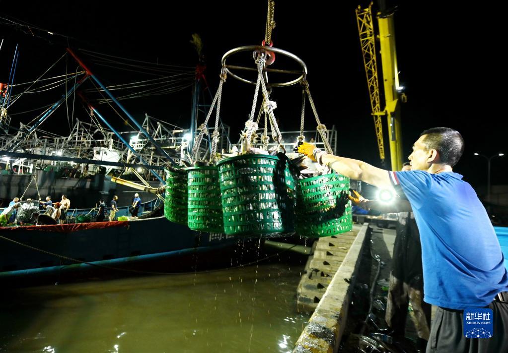 8月26日,工人在寧德市霞浦縣三沙中心漁港吊裝漁獲。