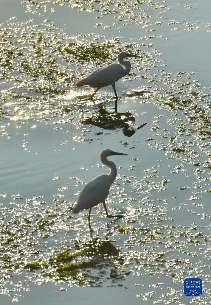 8月27日,白鷺在湖北省宣恩縣仙山貢水旅游區的濕地中覓食。