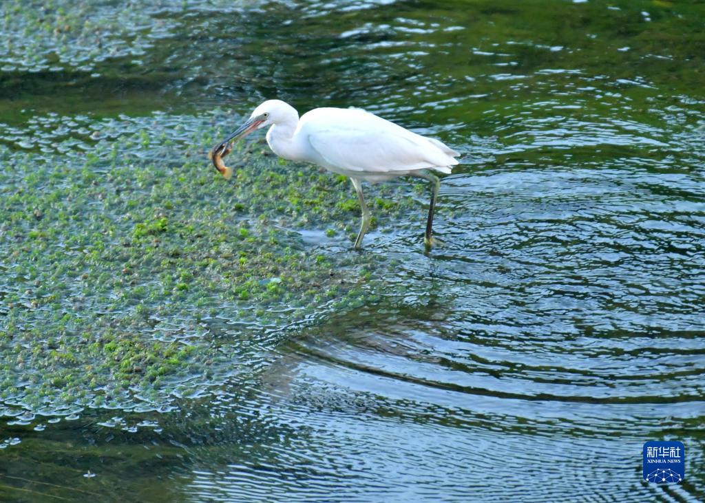 8月27日,白鷺在湖北省宣恩縣仙山貢水旅游區的濕地中覓食。