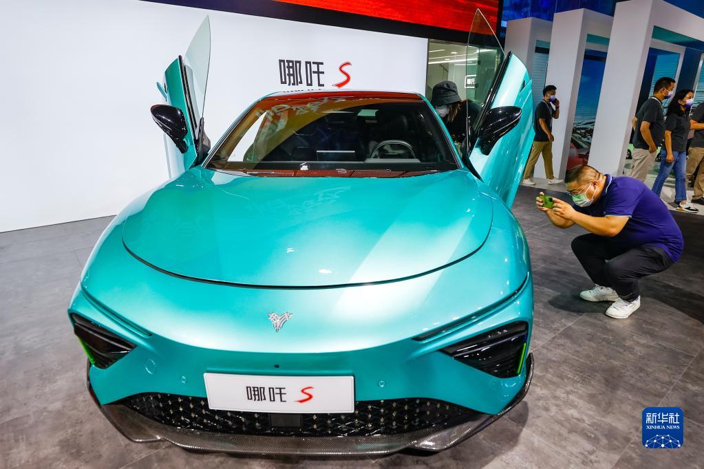 8月26日,在第二十五屆成都國際汽車展覽會的哪吒汽車展臺,參觀者在拍攝運動型智享轎跑哪吒S。