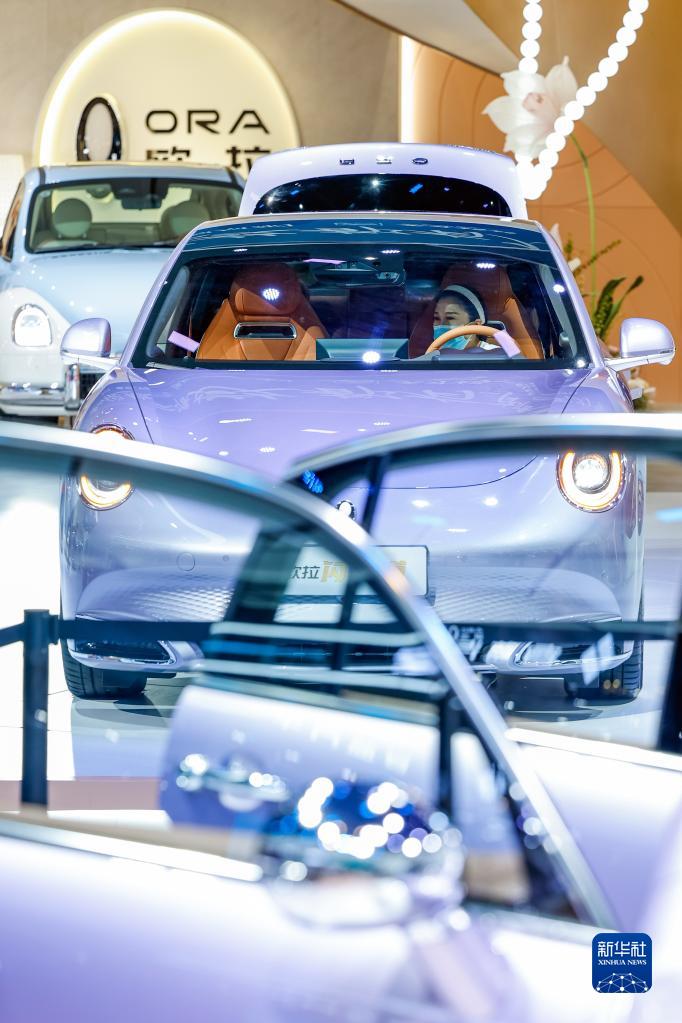 8月26日,在第二十五屆成都國際汽車展覽會的長城歐拉汽車展臺,參觀者在體驗新能源汽車“歐拉閃電貓”。