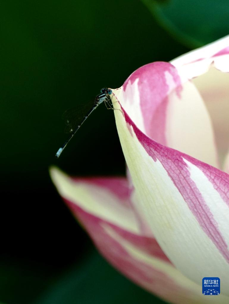 8月27日,在上海辰山植物園,一只昆蟲停留在荷花的花瓣上。