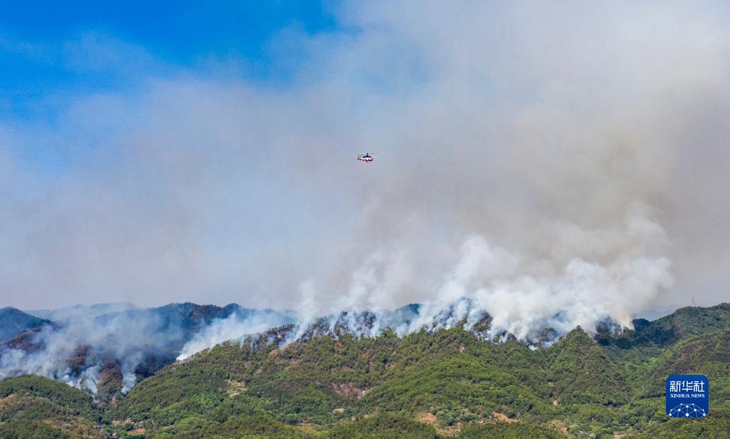 8月22日,在重慶市巴南區界石鎮,一架救援直升機在勘察火場情況(無人機照片)。